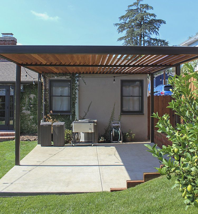 Concrete slabs can work by themselves, or even better with a pergola, where they also act as an anchor. There’s also coloring and stamping that can be used to give the concrete the look you want.